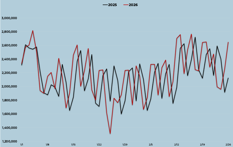 Daily Passenger Counts at U.S. Airports, 2026 vs. 2025