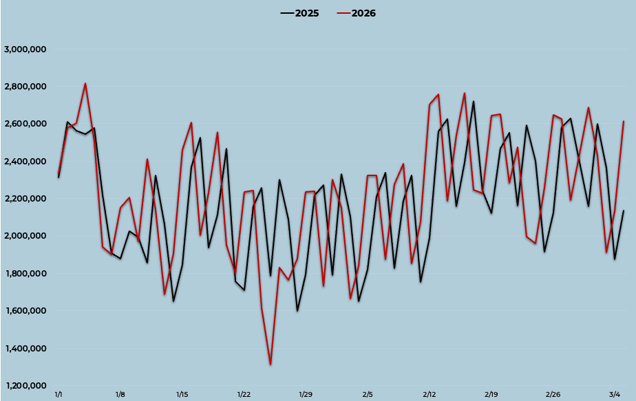 Daily Passenger Counts at U.S. Airports, 2026 vs. 2025