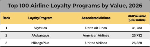 This includes the complete 1-100 ranking, the program name, associated airlines, and value of loyalty program in 2026 and how it has changed since 2023. Upgrade now for complete visibility.
