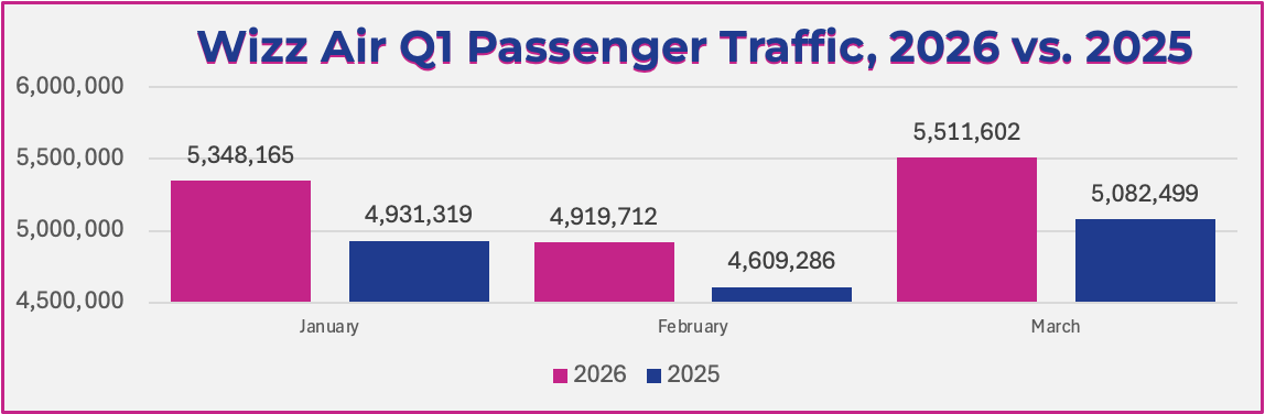 Wizz Air (W6) enjoyed an 8.4 percent uptick in March passenger traffic, with the Hungarian concern filling 90 percent of its revenue seats with 5,511,602 passengers. For the first quarter of 2026, Wizz’s passenger traffic is up just under eight percent to 15,781,505.