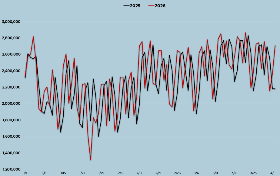 Daily Passenger Counts at U.S. Airports, 2026 vs. 2025