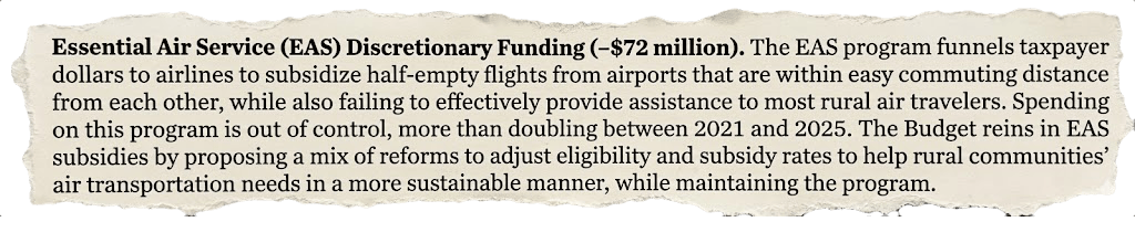 The president’s budget proposal also aims for deep cuts to the Essential Air Service (EAS), a U.S. government program established after the 1978 airline deregulation to ensure that small and rural communities maintain a minimal level of scheduled commercial flights. By providing federal subsidies to airlines, the program guarantees that these otherwise unprofitable locations remain connected to the national air transportation system through at least one major hub. EDITOR’S NOTE: Recent EAS routes include Sun Country Airlines’ (SY) rather dubious flight from Eau Claire, Wis. (EAU) to Fort Myers, Fla. (RSW), a route which ends for the 2026 season today.