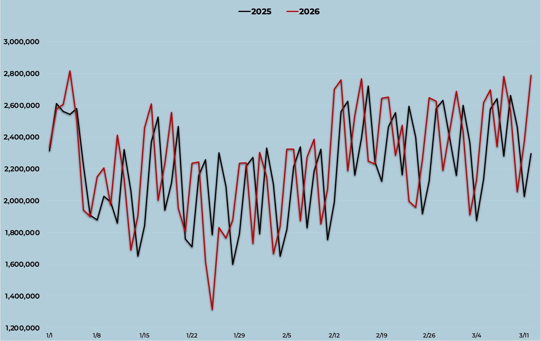 Daily Passenger Counts at U.S. Airports, 2026 vs. 2025